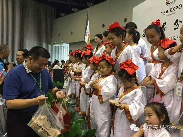 2016年7月15日在悅享中國茶——山西太原首屆少兒“無我茶會”上百年老字號天祥茶號有限公司總經(jīng)理吳宏昌贈送孩子們天祥茶號浮梁茶。