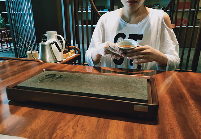 茶妹托進(jìn)三款茶來,我問:“是從低往高喝嗎?”茶客中的女人應(yīng)答:好的!我尋聲望去,這婦人五十開外,一頭短發(fā),身著淺灰色茶人服,眼睛炯炯有神,臉色紅潤光澤。說話間,她從黑色的拎包中取出一只青花主人瓷杯,這杯光澤而玉潤,如豬油抹了,是松柴窯燒之物。茶妹取第一款“古樹野樅”置茶盞,另一男賓深深地聞了干茶后,隨手取一枝干茶放口中細(xì)細(xì)嚼起來,并向婦人點了點頭。茶妹置茶蓋碗中,搖晃幾遍,男賓開蓋聞干香;茶妹沸水沖泡出湯。男賓又一次開蓋聞濕香,并將碗蓋呈女賓深聞。一切,他們都在無聲的默默進(jìn)行中。